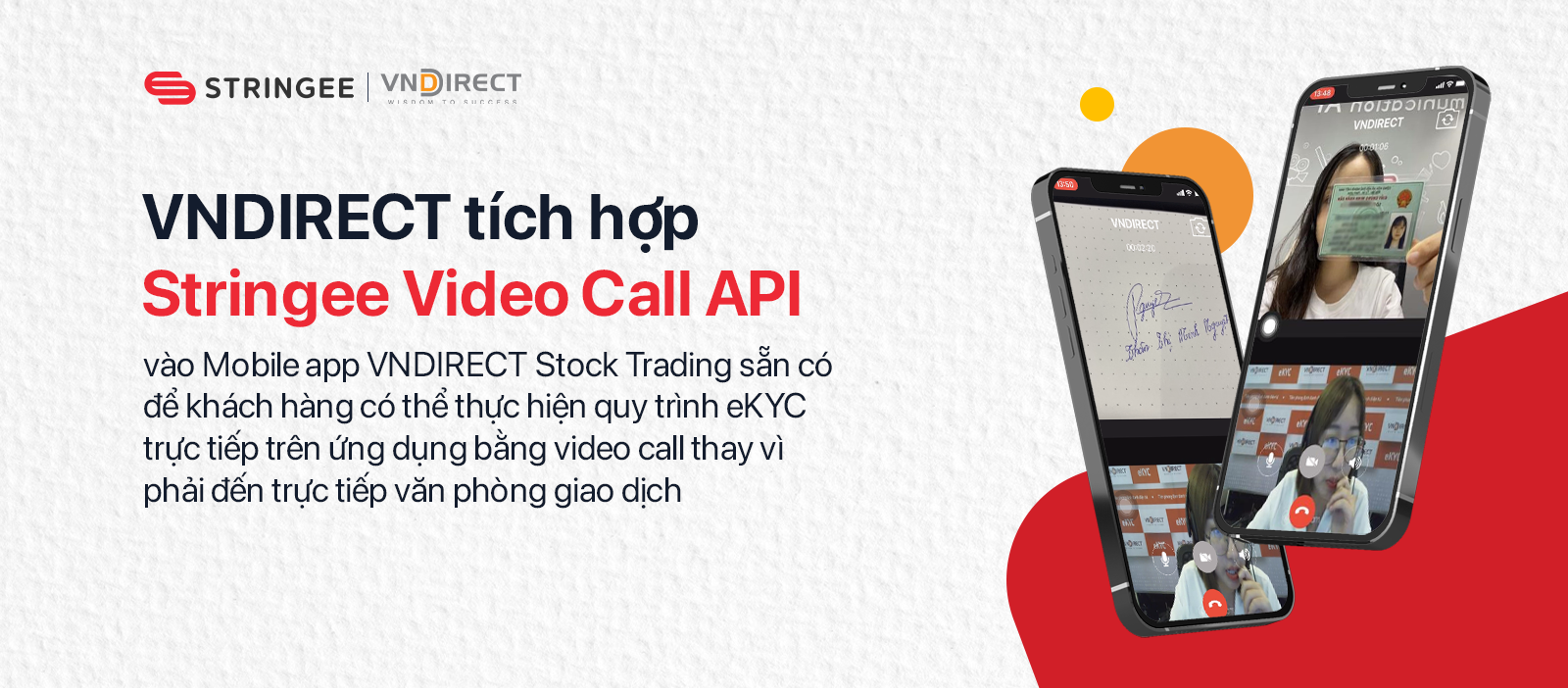 Bên cạnh đó, với Stringee Video Call API, tốc độ ứng dụng và triển khai công nghệ được đẩy nhanh, giúp VNDIRECT trở thành đơn triển khai giải pháp eKYC sớm nhất trong lĩnh vực tài chính. Giải pháp định danh khách hàng eKYC qua Video Call giúp VNDIRECT loại bỏ rào cản địa lý, thời gian khi thu hút nhiều nhà đầu tư mới mở tài khoản giao dịch. Đây cũng là bước tiến mới về công nghệ của VNDIRECT, giúp mang đến sự tiện lợi và nâng cao trải nghiệm khách hàng và sự hài lòng của khách hàng.